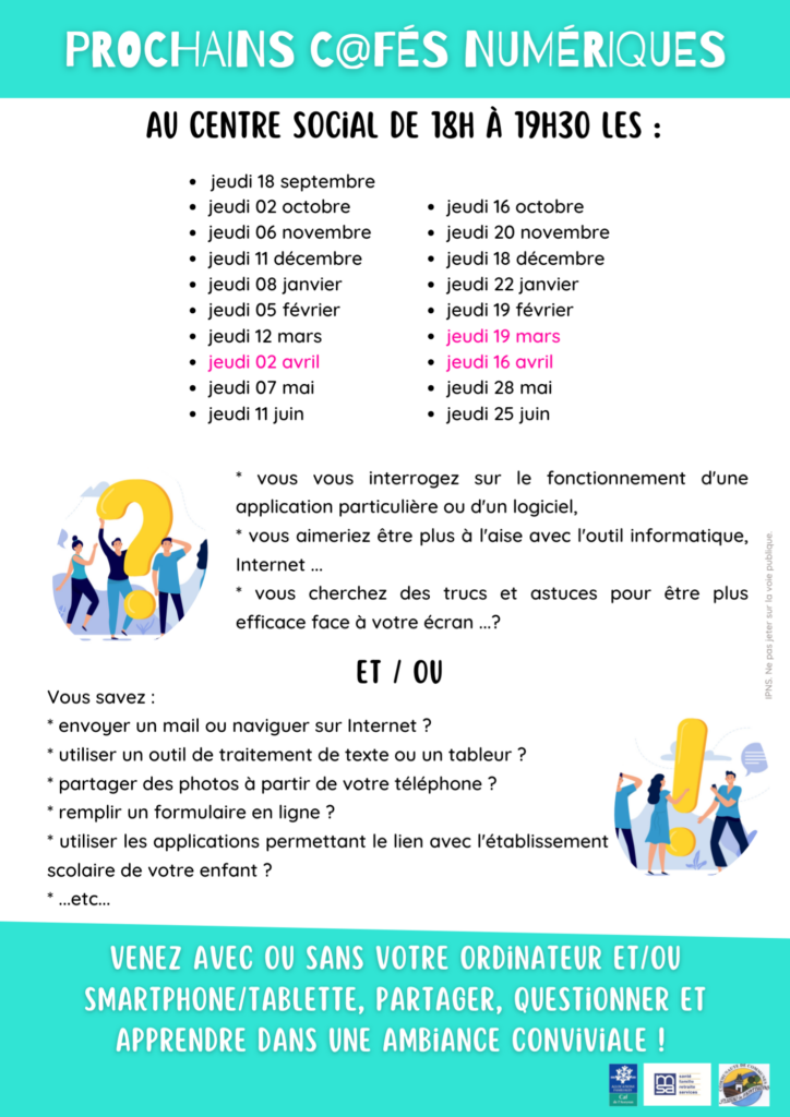 Tous les 15 jours, selon calendrier prรฉ-รฉtabli, le Centre Social vous propose un rendez-vous d’รฉchanges de savoirs : ยซย ๐‹๐ž ๐‚๐š๐Ÿ๐žฬ ๐๐ฎ๐ฆ๐žฬ๐ซ๐ข๐ช๐ฎ๐žย ยป !