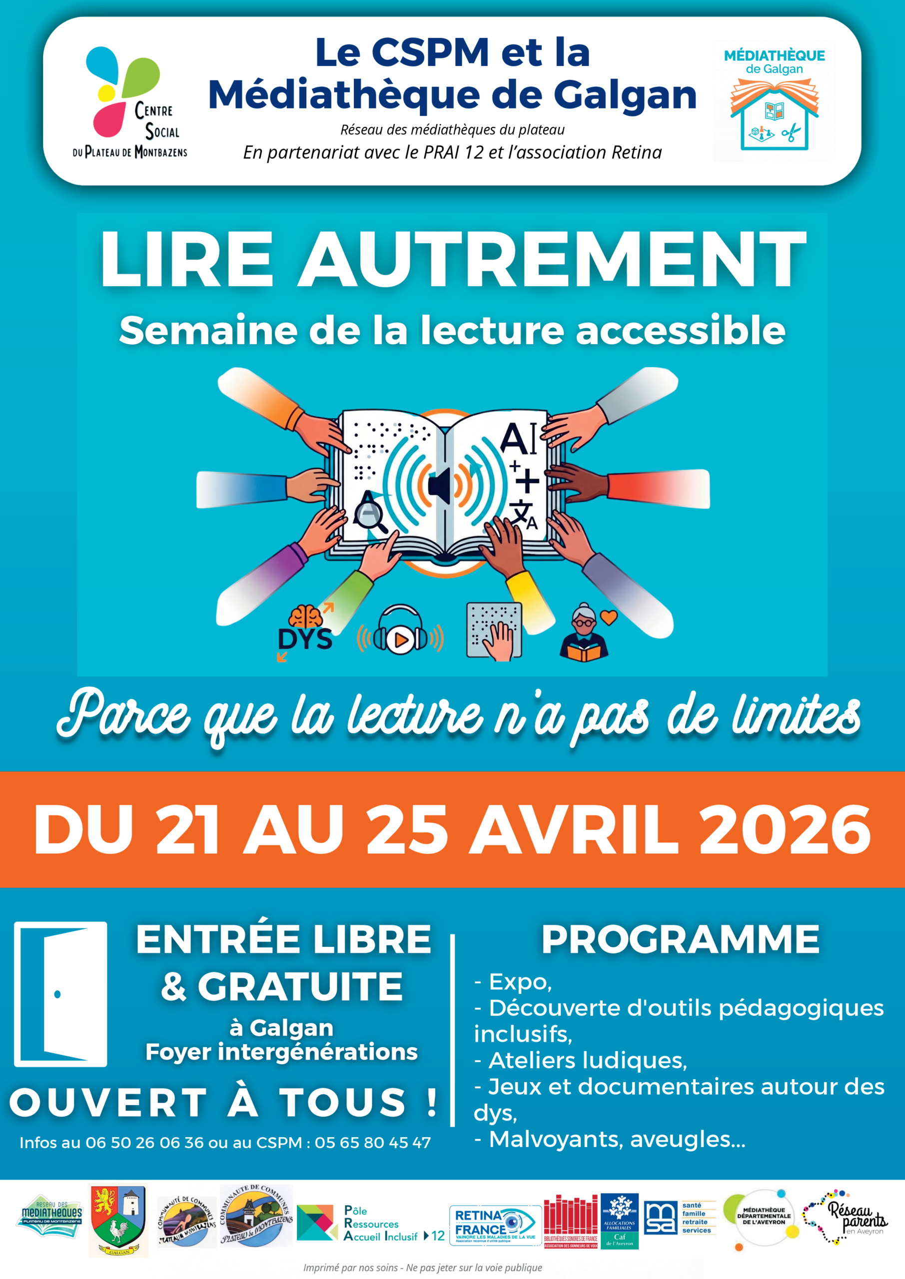 Action proposée par la Médiathèque de Galgan et le CSPM en partenariat avec le PRAI 12 et l'association Rétina Expo, découverte d'outils pédagogiques inclusifs, ateliers ludiques, jeux et documentaires autour des dys, malvoyants, aveugles... à Galgan - au Foyer Intergénérations Ouvert à tou.te.s Infos au 06 50 26 06 36 ou au CSPM au 05 […] |