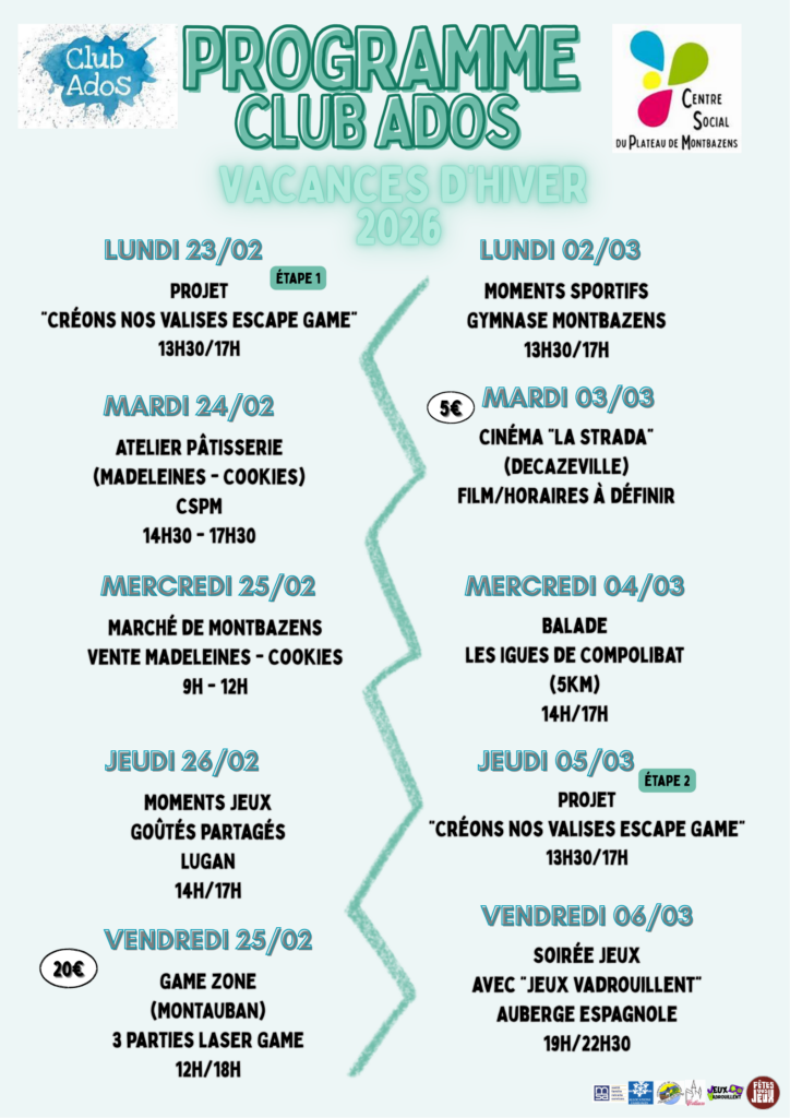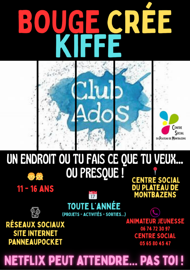 Le  « Club Ados » du Centre Social du Plateau de Montbazens a pour vocation d’accueillir les jeunes à partir de leur entrée au collège (à partir de 11 ans) et de leur proposer, tout au long de l’année, des animations et activités.