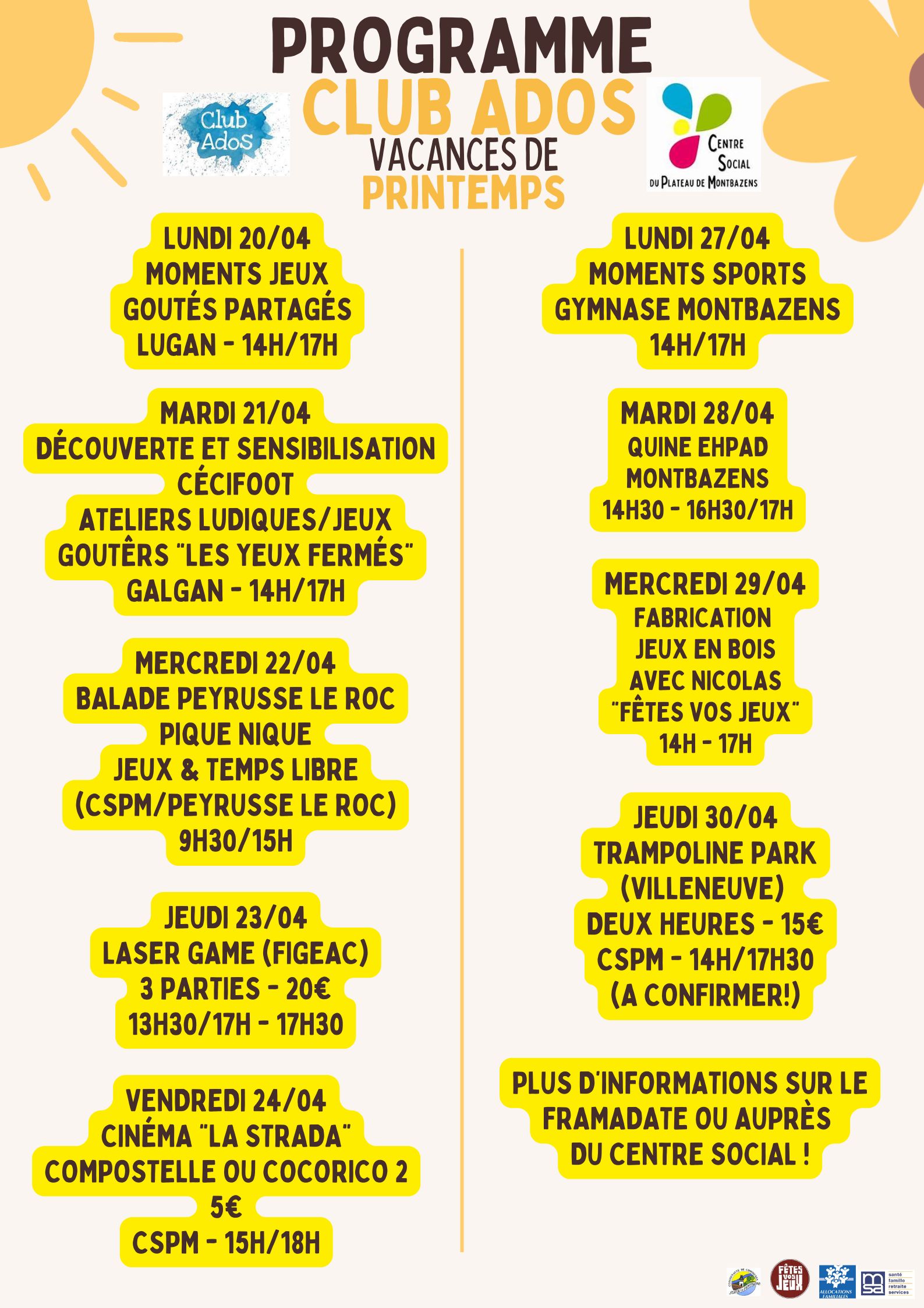 Le « Club Ados » du Centre Social du Plateau de Montbazens a pour vocation d’accueillir les jeunes à partir de leur entrée au collège (à partir de 11 ans) et de leur proposer, tout au long de l’année, des animations et activités.